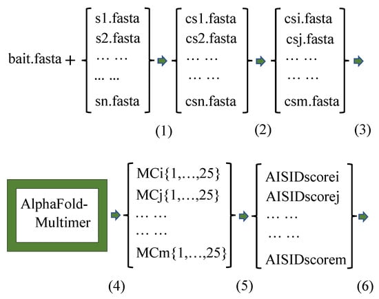 In this presented AISID method for specific protein bindings screening, the AlphaFold-Multimer [] was used to calculate the ranking metric. The AlphaFold-Multimer is a publicly available software package (https://github.com/deepmind/alphafold, accessed on 18 March 2022) recently released by DeepMind which extends the AlphaFold2 to multiple chains during both training and inference with native support for multiple-chain featurization and symmetry handling, surpassing those of inference-only modifications to the AlphaFold2.