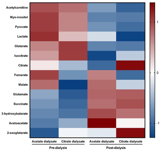 In this paper, we analyzed the inter-dialysis and intra-dialysis changes in the metabolomic profile of hemodialysis patients after being exposed to either citrate or acetate dialysates using a targeted metabolomics approach. Thus, we aim to add information that could help biologically explain the clinical improvements found in patients using citrate dialysate [,,,].