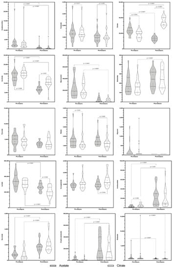 Violin plot representing the pre- and post-dialysis measured concentrations of the fifteen studied metabolites with each dialysate. Statistically significant differences are marked.