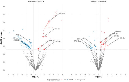 Volcano plot of differentially expressed miRNAs in both cohorts.