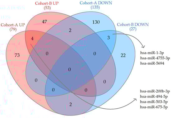 Venn diagram of upregulated and downregulated miRNAs in both cohorts.