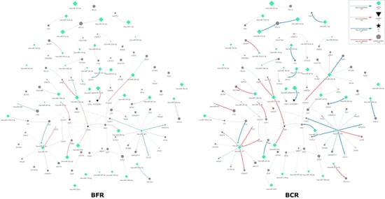 Using these miRNA-Seq data, as well as RNA-Seq data obtained in our previous study [], we performed Spearman correlation analysis for the miRNAs and their targets according to predicted and validated databases among the BCR and BRF groups. Indeed, 77 miRNA–target pairs (41 unique miRNAs and 75 unique targets) were differentially correlated and supplemented with PPI and TF–target interactions (Figure 3, Table S2, with the dynamic networks presented in Supplementary Files S1 and S2).