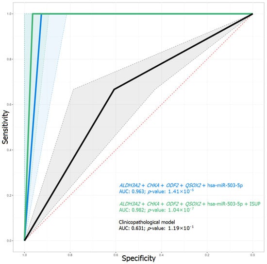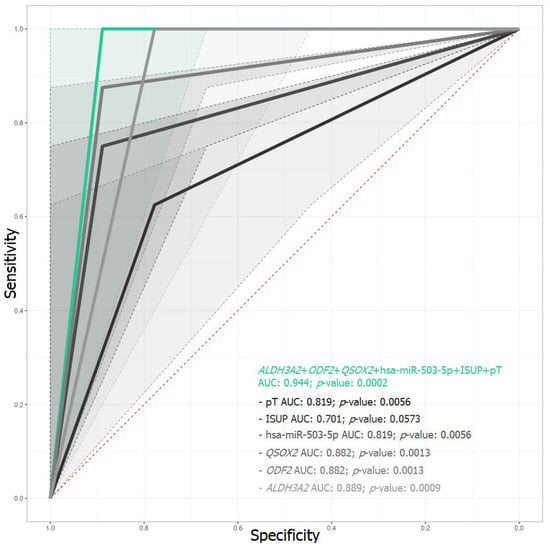 The combination of predictors ALDH3A2 + ODF2 + QSOX2 + hsa-miR-503-5p + ISUP + pT proved to be the most promising, with a sensitivity of 0.89, specificity 1, and AUC 0.944 for the test dataset (Table S4). At the same time, it should be emphasized that all models omitting any one of the predictors were much inferior in predictive power to the above prognostic model (ALDH3A2 + ODF2 + QSOX2 + hsa-miR-503-5p + ISUP + pT, Figure 6, Table 5).