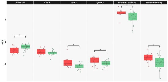 The relative levels of expression of the mRNAs (ALDH3A2, CHKA, ODF2, and QSOX2) and miRNA (hsa-miR-200b-3p and hsa-miR-503-5p) were evaluated by qPCR in extended Cohort-A samples belonging to the TMPRSS2-ERG subtype with known biochemical recurrence status (n = 31). Significant alterations in the relative expressions (p-value ≤ 0.05 according to the MW test and Spearman correlation, Figure 5) between the BCR and BRF groups for the ALDH3A2, ODF2, and QSOX2 genes, as well as for the hsa-miR-200b-3p and hsa-miR-503-5p miRNAs, were confirmed (Table 4). Since the change in the relative expression of the CHKA gene between groups was not significant according to the qPCR data, it was excluded from further analysis.