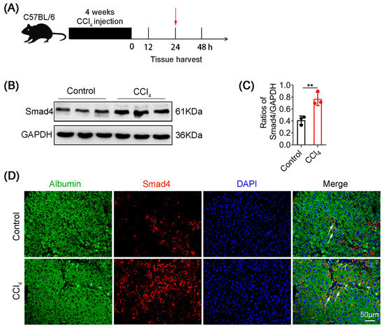 Smad4 expression is upregulated in hepatocytes during liver fibrosis. Groups of C57BL/6 mice were treated with CCl4 for 4 weeks to establish a liver fibrosis model (n = 6 per group). Data represent at least three independent experiments. (A) Schematic representation of CCl4-induced liver fibrosis. (B,C) Western blotting analysis of Smad4 protein levels in liver fibrosis tissues. Smad4 expression was normalized to the control GAPDH. (D) Double staining of albumin (green) and Smad4 (red) in liver fibrosis tissues (scale bars: 50 μm). Arrowheads indicated the double-positive cells. ** p < 0.01.