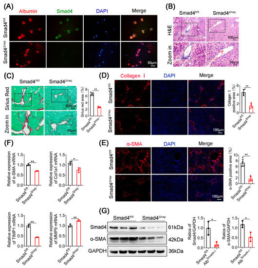 2.2. Hepatocyte-Specific Smad4 Deficiency Attenuates Liver Fibrosis