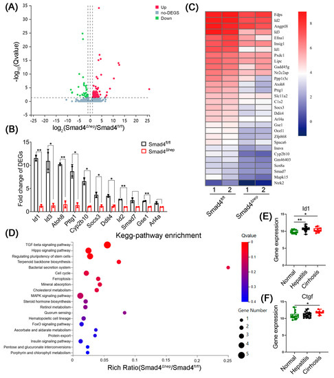 RNA sequencing analysis of DEGs in CCl4-induced liver fibrosis tissues. Smad4fl/fl and Smad4Δhep mice were treated with CCl4 for 4 weeks to establish the liver fibrosis model. The fibrotic liver tissues of Smad4fl/fl and Smad4Δhep mice were analyzed by RNA sequencing (n = 2 per group). (A) Volcano diagram of DEGs with p < 0.05. (B) Analysis of fold change in DEGs. (C) Heatmap of the expression of the most significantly downregulated genes. (D) The analysis of the related signal pathways of downregulated genes by KEGG. (E,F) The analysis of ID1 and CTGF expression in liver tissues from patients with hepatitis and cirrhosis in the GSE89377 dataset. Normal, n = 13; Hepatitis, n = 20; Cirrhosis, n = 14. * p < 0.05, ** p < 0.01.