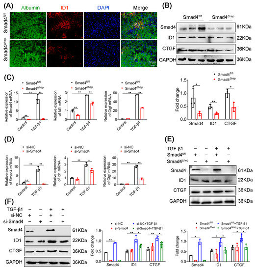Hepatocyte-specific Smad4 deficiency inhibited the expression of ID1 and CTGF. Smad4fl/fl and Smad4Δhep mice were treated with CCl4 for 4 weeks to establish the liver fibrosis model (n = 6 per group). Primary hepatocytes were isolated from Smad4fl/fl and Smad4Δhep mice and then treated with TGF-β1 (5 ng/mL) for 24 h. AML-12 cells were transfected with control siRNA or Smad4 siRNA, respectively, and then treated with TGF-β1 (5 ng/mL) for 24 h. (A) Double staining of Albumin (green) and ID1 (red) in fibrotic liver tissues (scale bars: 50 μm) and statistical analysis. Arrowhead indicated the double-positive cells. (B) Western blotting analysis of protein levels of Smad4, ID1, and CTGF in fibrotic liver tissues. Smad4, ID1, and CTGF were normalized to GAPDH. (C) The mRNA levels of Smad4, ID1, and CTGF in primary hepatocytes were measured using real-time PCR analysis. (D) The mRNA levels of Smad4, ID1, and CTGF in AML-12 cells were measured using real-time PCR analysis. (E) Western blot analysis of protein levels of Smad4, ID1, and CTGF in primary hepatocytes. Smad4, ID1, and CTGF were normalized to GAPDH. (F) Western blot analysis of protein levels of Smad4, ID1, and CTGF in AML-12 cells. Smad4, ID1, and CTGF were normalized to GAPDH. * p < 0.05, ** p < 0.01.