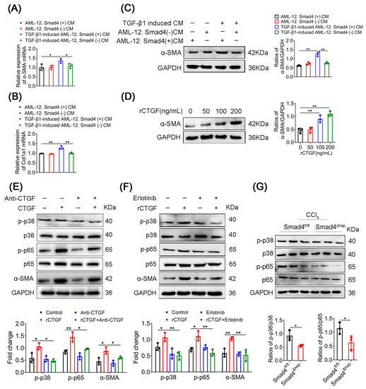 CTGF promotes HSCs activation via the EGFR receptor mediated p38/p65 signaling. AML-12 cells were transfected with control siRNA or Smad4 siRNA, respectively, and treated with TGF-β1 (5 ng/mL) for 24 h. Subsequently, the conditioned medium was collected to treat LX-2 cells. (A,B) The mRNA levels of α-SMA and Col1a1 in LX-2 cells were measured using the real-time PCR method. (C) Western blotting analysis of α-SMA protein levels in LX-2 cells. α-SMA was normalized to GAPDH. (D) LX-2 cells were treated with recombinant CTGF protein (0 ng/mL, 50 ng/mL, 100 ng/mL, 200 ng/mL) for 48 h. Western blotting analysis of protein levels of α-SMA in LX-2 cells. α-SMA was normalized to GAPDH. (E) LX-2 cells were treated with 200 ng/mL recombinant CTGF and 10 ug/mL CTGF-neutralizing antibody (Anti-CTGF) for 48 h. Western blotting analysis of protein levels of p-p38, p38, p-p65, p65, and α-SMA in LX-2 cells. p-p38 and p-p65 were normalized to p38 and p65, respectively, and α-SMA was normalized to GAPDH. (F) LX-2 cells were treated with 200 ng/mL recombinant CTGF and 10 nM Erlotinib for 48 h. Western blotting analysis of protein levels of p-p38, p38, p-p65, p65, and α-SMA in LX-2 cells. p-p38 and p-p65 were normalized to p38 and p65, respectively, and α-SMA was normalized to GAPDH. (G) Western blotting analysis of protein levels of p-p38, p38, p-p65, and p65 in fibrotic liver tissues. p-p38 and p-p65 were normalized to p38 and p65, respectively. * p < 0.05, ** p < 0.01.