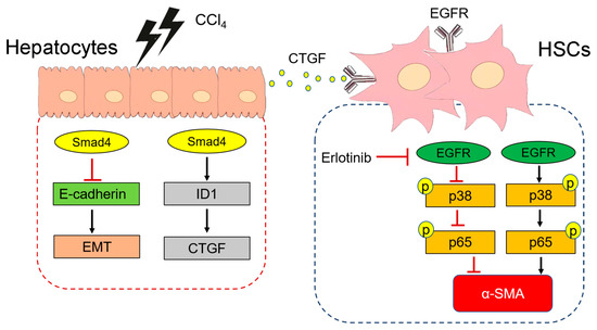 HSCs’ activation is a key step in the development of liver fibrosis. As the main effector cells of the fibrosis response, HSCs are particularly important autocrine or paracrine targets, especially in the activated state [4,43]. Liao et al. demonstrated that ID1 and MAPK signaling pathways were downstream of CTGF signaling, and ID1 partially upregulated CTGF through positive feedback [23]. Here, our results indicated that Smad4 expression in hepatocytes could activate HSCs through improving CTGF secretion, and thereby promoted liver fibrosis. Huang and Brigstock also confirmed that CTGF could promote liver fibrosis by promoting proliferation, survival, migration, adhesion, and ECM production of activated HSCs [44]. This result is consistent with our findings. It was recently reported that CTGF was able to regulate renal inflammation, cell growth, and fibrosis by binding to EGFR [25,45]. Therefore, we speculated that CTGF derived from hepatocytes might stimulate the activation of HSCs via EGFR. Interestingly, our results showed that the presence of erlotinib (EGFR inhibitor) attenuated HSCs’ activation stimulated by CTGF, and that the p38/MAPK signaling pathway was downregulated in CCl4-induced liver fibrotic tissues of Smad4Δhep mice. Consistently, Fuchs et al. also found that erlotinib could inhibit the activation of HSCs by reducing EGFR phosphorylation in HSCs [46]. At present, some studies have taken the inhibition of HSCs’ activation as a therapeutic target for liver fibrosis [4]. Yan et al. confirmed that phosphorylated p38 was upregulated in activated HSCs [27]. p38 is known to play an important role in the process of liver fibrosis [23], and the activation of p38α/MAPK promotes hepatocyte proliferation and chronic liver inflammation [47]. Interestingly, Ras/Raf/MAPK and PI3K/AKT, two major signaling pathways downstream of EGFR, can promote mitosis and prevent apoptosis in lung cancer cells [48]. Phosphorylated EGFR can trigger downstream signaling to promote proliferation, metastasis, and angiogenesis of lung cancer cells [49]. As a ubiquitous inducible transcription factor, nuclear factor-κB (NF-κB) can mediate the expression of a large number of intracellular genes involved in differentiation, apoptosis, and proliferation [50,51]. The activation of NF-κB can affect the activation of HSCs and promote liver inflammation, fibrosis, and hepatocellular carcinoma [50,52]. Some studies suggested that p38/MAPK was associated with the inflammatory signaling pathway p65/NK-κB in chronic hepatitis and HCC [26]. Consistently, our study demonstrated that hepatocyte-derived CTGF increased the phosphorylation of p38 and p65 and promoted HSCs’ activation through EGFR, thereby contributing to liver fibrosis.