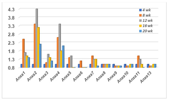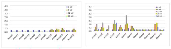 A temporal transcriptomic comparison of the twelve annexin genes expressed in the salivary glands of SSNS C57BL/6J versus SSS C57BL/6.NOD-Aec1Aec2 mice is presented in Figure 1. The profile exhibited within the salivary glands of C57BL/6J mice (left panel) shows a complete lack of any upregulated gene expressions for Anxa1-7 and Anxa11 between the ages of 4 to 20 weeks of age. In contrast, a weak temporal upregulated expression was exhibited for Anxa8-10 and Anxa13 with maximum expression occurring around 8 and 12 weeks of age. On the other hand, the profile exhibited within the salivary glands of the C57BL/6.NOD-Aec1Aec2 mice (right panel) revealed a completely opposite result with upregulated temporal expressions for annexin genes Anxa1-7 and Anxa11, but a lack of any changes in gene expressions for Anxa8-10 and Anxa13. In addition, while each of these upregulations were observed starting at 8 weeks of age, maximum expressions of annexins Anxa1-7 occurred around 12 weeks of age, with annexin Anxa11 apparently exhibiting a more prolonged upregulated expression.