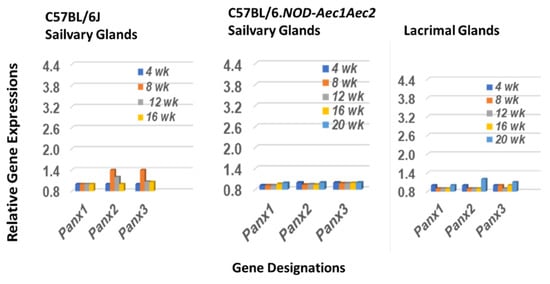 The three-member family of mammalian pannexins was chosen as a comparative control for the annexin data. Pannexins are glycoproteins that form single membrane associated ATP-release channels that are ubiquitously expressed in most cells, including the salivary and lacrimal glands, and functionally active in both normal and disease states, including inflammation [49]. As presented in Figure 3, a slightly upregulated gene expression is observed for two of the three pannexins, Panx2 and Panx3, in the salivary glands of SSNS C57BL/6J mice, but none of the three genes are upregulated in either the salivary or lacrimal glands of SSS C57BL/6.NOD-Aec1Aec2 mice.