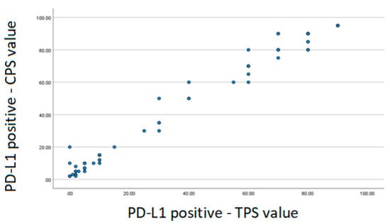 Regarding the expression of PD-L1, this study found 55.8% positivity. The analysis was performed for both TPS and CPS. A strong correlation was observed between them when we performed Spearman’s correlation. Thus, when PD-L1 was positive, there was an association between the value of TPS and CPS. Note that the higher the TPS value, the higher the CPS value.