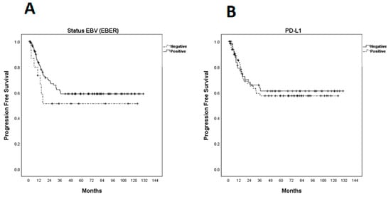 Kaplan–Meier curves for progression-free survival (PFS). (A) PFS according to EBER (Epstein–Barr-virus-encoded small RNAs); (B) PFS according to programmed cell death ligand-1 expression.