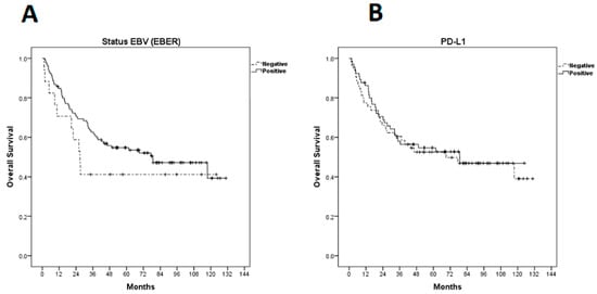 Kaplan–Meier curves for overall survival (OS). (A) OS according to EBER (Epstein–Barr-virus-encoded small RNAs); (B) OS according to programmed cell death ligand-1 expression.