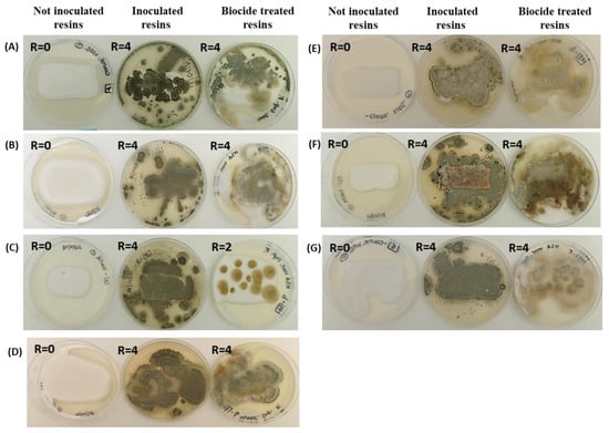 Representative visual observations of the fungal growth after 7 days of incubation on the surfaces of seven different polymers: (A) AC 012, (B) AC 013, (C) PU H6, (D) PU MW2, (E) PUGS, (F) ACP1, (G) AC 32. For each sample, non-inoculated control resins, resins inoculated with fungi, and resins treated with biocide and inoculated with fungi were considered. The R rating values (from 0 to 4) are also indicated.