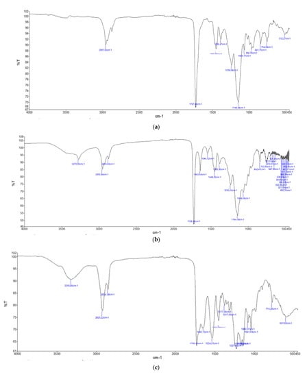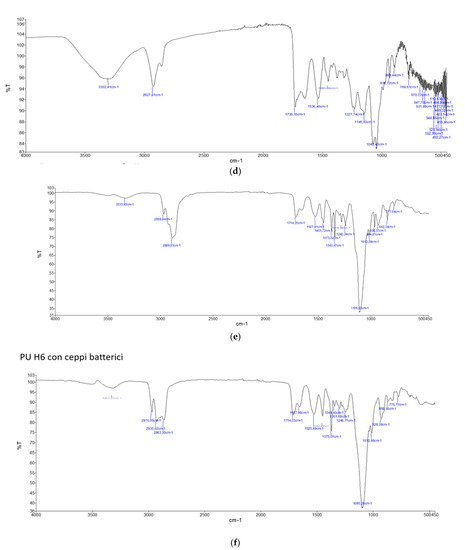 The IR spectra of the polyurethane polymers (PU H6, PU GS, PU MW2) had a characteristic signal around 1700 cm−1, assigned to the carbonyl stretching vibration of the carbamate group, located at 1714 cm−1 for PU H6 and 1700 cm−1 for PU GS, while this signal was found to be superimposed on that of the esters at 1730 cm−1 for PU MW2 [15]. The signals around 3300–3350 cm−1 and 1530 cm−1, assigned to the stretching and bending, respectively, of the secondary amidic N-H bond present in the carbamate group, were also clearly visible. In addition, the intense signal at 1100 cm−1 present in PU H6 and PU GS was attributable to the stretching of the ether C–O bonds present in the polyether chains that were distant from the carbamate groups. In the sample PU MW2, the signals at 1230 cm−1 were visible, and attributed to the stretching of the C–O ester bond. The signals between 2970 and 2860 cm−1 were due to the vibrations of the C–H bonds present in the main chain of the macromolecule (Supplementary Figure S3).