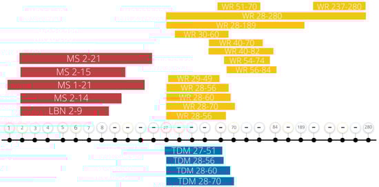 Summary of current ELS and exercise intervention protocols. This summary figure represents the days, recorded in postnatal days, of early life stress exposure and exercise interventions recounted in this review. Note the variability in experimental parameters. MS, maternal separation; LBN, limited bedding and nesting; WR, wheel running; TDM, treadmill; “…”, breaks in the timeline.