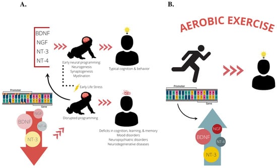 Our proposed theoretical framework. (A) Based on previous studies, it is known that BDNF, NGF, NT-3, and NT-4 facilitate early neural programming of the brain by promoting neuronal survival and outgrowth during the perinatal period. Proper neural development during early life facilitates cognitive abilities and protects against neurobehavioral insults later in life, such as depression and anxiety disorders and neurodegenerative diseases. Experiencing early life stress can lead to dysregulation of these vital neurotrophins through epigenetic mechanisms such as DNA methylation, often leading a reduction in neurotrophin expression. This leads to disruptions in early neural programming that can stay with an individual throughout their lifespan and put them at an increased risk for developing deficits in cognition, learning, and memory, as well as neuropsychiatric disorders and neurodegenerative diseases. (B) We propose aerobic exercise as a treatment mechanism to normalize neurotrophin expression and bolster cognition and neural health by reversing epigenetic perturbations set forth in early life. BDNF, brain-derived neurotrophic factor; NGF, nerve growth factor; NT-3, neurotrophin-3; NT-4, neurotrophin-4.