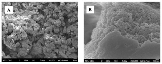 FESEM images of the lyophilized CUR-BSA nanoplex viewed at (A) low and (B) high magnifications.