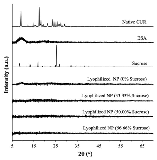 The lyophilized CUR-BSA nanoplex was stored in a desiccator set to 40 °C and 75% relative humidity (RH) for 30 days. The 75% relative humidity condition was generated by placing an open container of a saturated NaCl solution in the desiccator overnight at 40 °C. The amorphous forms of the lyophilized nanoplex were characterized before and after the 30-day exposures by powder X-ray diffraction (PXRD) using a D8 Advance X-ray Diffractometer (Bruker, Germany) performed between 10° and 70° (2θ) with a step size of 0.02° and a scanning rate of 1.2°/min. PXRD analyses of the native CUR, native BSA, and raw sucrose were also performed. The PXRD characterization protocols were in agreement with the protocols presented in [,,].