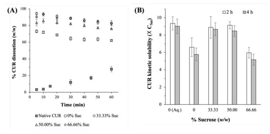 On the other hand, a lower CUR kinetic solubility at 5.1–5.8 × CSat was observed for the lyophilized nanoplex prepared at a 66.66% sucrose mass fraction, suggesting that the presence of excessive sucrose in the dissolution medium reduced the CUR kinetic solubility. Likewise, the CUR kinetic solubility was also lower, at around 5.8–6.6 × CSat, for the nanoplex lyophilized without sucrose. The lower CUR kinetic solubility in the absence of sucrose was postulated to be caused by the abovementioned slower dissolution rate of the lyophilized nanoplex without sucrose due to its poor aqueous reconstitution. The slower dissolution rate, in turn, increased the solution-mediated crystallization tendency of the amorphous solids during dissolution, resulting in a partial loss of kinetic solubility [].
