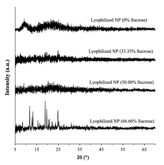 On the other hand, a PXRD analysis of the lyophilized nanoplex prepared at a 66.66% sucrose mass fraction showed several strong intensity peaks at 2 ≈ 12°, 13°, 18°, 20°, and 25, indicating that an amorphous-to-crystalline transformation was taking place. As the nanoplex lyophilized without sucrose was not found to recrystallize postexposure, denoting the inherently high stability of the CUR-BSA nanoplex, the amorphous-to-crystalline transformation observed at a 66.66% sucrose mass fraction was postulated to be triggered by the recrystallization of amorphous sucrose.