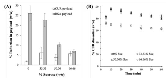 A similar trend was observed in the experimental BSA payloads (Figure 2B). The theoretical BSA payloads at 0, 33.33%, 50.00%, and 66.66% sucrose mass fractions were calculated to be equal to ≈45%, 30%, 22.5%, and 15%, respectively. The corresponding experimental BSA payloads were lower by between 5 and 6%, at 40.3 ± 2.8%, 25.4 ± 1.7%, 15.8 ± 0.5%, and 9.6 ± 0.4% (w/w), respectively. The similar magnitude in the deviations in the CUR and BSA experimental payloads from the theoretical values reaffirmed the postulate that the loss in payload was indeed caused by the mass loss incurred prelyophilization, instead of being caused by the thermal and mechanical stresses of lyophilization.