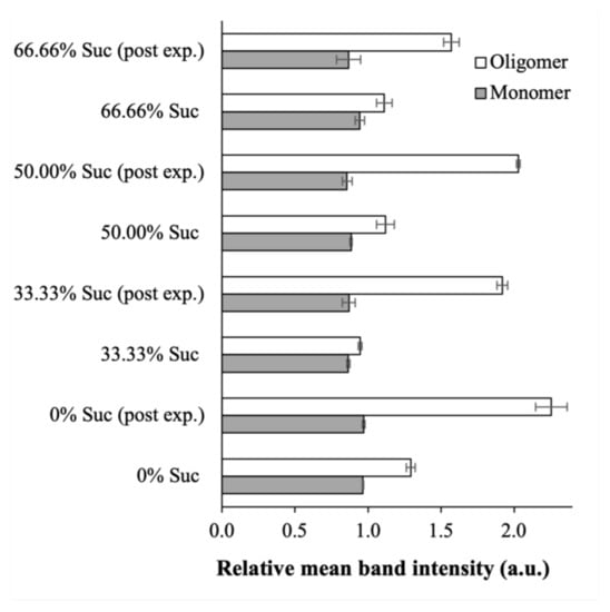 The SDS-PAGE gel images of the lyophilized nanoplexes prepared at different sucrose mass fractions (Columns 5, 7, and 9) showed similar protein bands as the raw BSA. No obvious increase in the intensity of the oligomer bands was observed. This signified an absence of significant protein aggregation due to unfolded proteins after lyophilization. Using sucrose as the cryoprotectant, the densitometry analysis revealed that the relative mean intensities of the protein bands (both monomer and oligomer) of the lyophilized nanoplexes were either equal or slightly smaller/larger than unity when calculated with respect to the raw BSA’s intensities (Figure 8). In contrast, the oligomer band’s relative intensity in the nanoplex lyophilized without sucrose (Column 3) was equal to ≈1.3, denoting a roughly 30% increase due to protein aggregation. In short, the structural integrity of the BSA in the nanoplex was maintained after lyophilization with sucrose, signifying the good cryoprotective activity of sucrose. Sucrose’s good cryoprotective activity towards albumin reported in the present work was in agreement with the results of previous studies [,].
