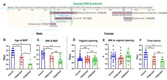 FSHβ13AA/FSHβ16AA hastens puberty in male and female mice. (A) Timeline in the identification of the receptor-binding sites of human (h) FSH β subunit. In 1990, two regions corresponding to hFSH-β-(33–53) [14] and hFSH-β-(81–95) [16] were identified as receptor binding sites. Later, within the two larger receptor-binding domains of the hFSH-β-subunit, a subdomain with four amino acid residues 34–37 (TRDL) [17] within hFSH-β-(33–53), and another subdomain with six amino acid residues 90–95 (DSTDCT) [19] within hFSH-β-(81–95) were identified as core binding determinants. In 2017, Liu et al. reported the receptor binding site of the hFSH-β-subunit was a 13-amino acid sequence (33–53), referred to as Nature-13 core AA, as this discovery was published in Nature [21]. (B) A single treatment (200 μg/g BW) of either FSHβ13AA or FSHβ16AA (A) on day 25 accelerated the pubertal onset in male mice as assessed by balanopreputial separation (BPS). (C) Body weight on the day of the pubertal onset in male mice. (D) One treatment (200 μg/g BW) of FSHβ13AA/FSHβ16AA (A) on day 25 hastened puberty in females as assessed by the vaginal opening. (E) Body weight on the day of the vaginal opening. (F) Similarly, these peptide treatments (A) on day 25 accelerated the pubertal onset (based on first estrus). Data are expressed as mean ± SEM. NS, not significant, * p < 0.05, ** p < 0.01, *** p < 0.001.