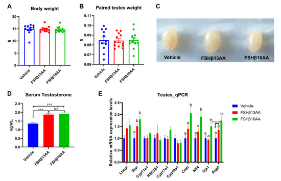 Repeated FSHβ13AA/FSHβ16AA treatments promote testicular steroidogenesis in prepubertal male mice. Giving 200 μg/g BW of either FSHβ13AA or FSHβ16AA (Figure 1A) once daily on days 25 to 28 had no significant effects on the body (A) or the paired testes weights (B) of the prepubertal male mice on day 29. (C) Representative testes in all of the treatment groups. (D) Serum testosterone concentrations of the male mice on day 29. (E) Levels of the mRNA expression of the steroidogenesis- and spermatogenesis-associated genes in the testes on day 29. Lhcgr, luteinizing hormone receptor; Star, Steroidogenic acute regulatory protein; Cyp11a1, cytochrome P450 family 11 subfamily A member 1; Hsd3β1, 3beta-hydroxysteroid dehydrogenase type 1; Cyp17a1, cytochrome P450 family 17 subfamily A member 1; Cyp19a1, cytochrome P450 family 19 subfamily A member 1 (aromatase); Creb, cAMP response element-binding protein; Klf4, Kruppel-like factor 4; Gja1, Gap junction alpha-1 protein; Aqp8, aquaporin 8; Data are mean ± SEM. a,b Means without a common letter differed (p < 0.05), NS, not significant, *** p < 0.001.