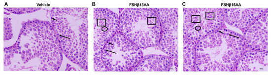 FSHβ13AA/FSHβ16AA on days 25 to 28 in the prepubertal male mice promote the complete spermatogenesis on day 29. (A) Representative photomicrographs of the testes from the control mice containing only spermatogonia (short arrow) and primary spermatocytes (long arrow). Photomicrographs of the testes from FSHβ13AA- (B) or FSHβ16AA-injected (C) males containing spermatogenic cells at various stages of development, including spermatogonia (short arrow), primary spermatocyte (long arrow), early spermatids (ellipse), late (mature) spermatids (square). Testes were stained with H&E (×400, scale bar = 10 μm).