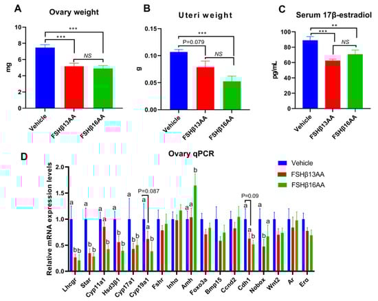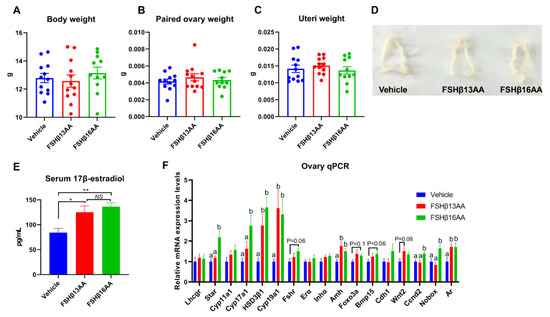 FSHβ13AA/FSHβ16AA on days 25 to 28 in the prepubertal female mice promote ovarian steroidogenesis and the follicle development on day 29. Four consecutive peptide treatments had no significant effects on the body (A), paired ovaries (B), or uteri (C) weights on day 29. (D) Representative images of the ovaries and uteri from each group. (E) Serum 17β-estradiol concentrations on day 29. * p < 0.05, ** p < 0.01, NS, not significant. (F) mRNA expression levels of the ovarian steroidogenesis- and follicle development-associated genes. Lhcgr, luteinizing hormone receptor; Star, Steroidogenic acute regulatory protein; Cyp11a1, cytochrome P450 family 11 subfamily A member 1; Hsd3β1, 3beta-hydroxysteroid dehydrogenase type 1; Cyp17a1, cytochrome P450 family 17 subfamily A member 1; Cyp19a1, cytochrome P450 family 19 subfamily A member 1 (aromatase); Fshr, follicle-stimulating hormone receptor; Erα, estrogen receptor 1; Inha, inhibin α; Amh, anti-Müllerian hormone; Foxo3a, forkhead box O3A; Bmp15, bone morphogenetic protein 15; Cdh1, cadherin 1; Wnt2, wingless-type MMTV integration site family, member 2; Ccnd2, cyclin D2; Nobox, NOBOX oogenesis homeobox; Ar, androgen receptor. Data are mean ± SEM. a,b Means without a common letter differed (p < 0.05).