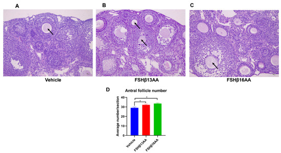 FSHβ13AA/FSHβ16AA on days 25 to 28 promote the ovarian follicular development in prepubertal female mice. Representative images of the antral follicles (arrow) from the vehicle-injected control mice (A), FSHβ13AA- (B) or FSHβ16AA-injected (C) females. (D) Morphometric analyses of the antral follicle number from at least three ovaries/group. Tissues were stained with H&E (×200, scale bar = 10 μm). Data are mean ± SEM. * p < 0.05.