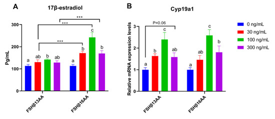 For evaluating the effects of FSHβ13AA/FSHβ16AAT on the estradiol production, 3 × 104 cells per well were cultured under standard conditions for 24 h. Then, 0, 30, 100 and 300 ng/mL of FSHβ13AA or SHβ16AA was added and incubated for 24 h. Following the treatment, the cell culture supernatants and the cells in each well were collected and kept at −80 °C, pending further analysis.