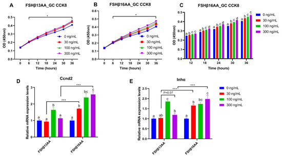 FSHβ13AA/FSHβ16AA promotes the proliferation of the primary murine GCs in vitro. Effects of the dose of FSHβ13AA (A) or FSHβ16AA (B) on the proliferation of the primary GCs in vitro. * p < 0.05 for comparison of the peptide-treated versus the vehicle-treated (0 ng/mL) by repeated-measures 2-way ANOVA with Holm–Sidak’s multiple comparisons test. (C) FSHβ16AA promoted the proliferation of the primary ovarian GCs in a dose-dependent manner in vitro. a–c Within a treatment time point, the means without a common letter differed. (D,E) Effects of the dose of FSHβ13AA/FSHβ16AA addition on the mRNA expressions of Ccnd2 and Inhα in GCs. Ccnd2, cyclin D2; Inha, inhibin α. Data are expressed as mean ± SEM. *** p < 0.001.