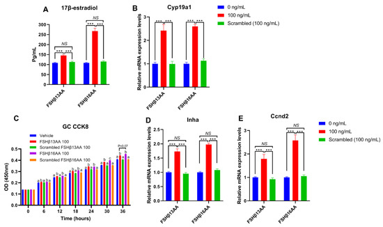 To verify that the effects of FSHβ13AA/FSHβ16AA on the reproductive modulation were not due to their size and/or global physico-chemical properties, a mixed scrambled peptide control (Supplemental Table S1) was designed for each peptide. In the experiments above, both FSHβ13AA and FSHβ16AA had the highest activities at 100 ng/mL. Compared to FSHβ13AA/FSHβ16AA, 100 ng/mL of the mixed scrambled peptides did not (p > 0.05) promote the 17β-estradiol production nor the cell proliferation of GCs in vitro (Figure 8). Similarly, there was no difference (p > 0.05) between the scrambled FSHβ13AA/FSHβ16AA peptides (100 ng/mL) and the vehicle control in promoting the cell proliferation or estrogen production of GCs (Figure 8).