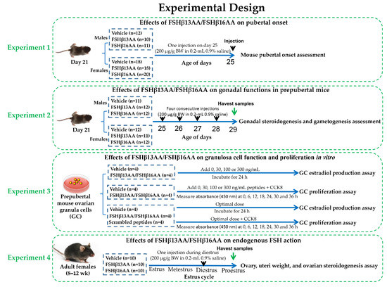 To assess the bioactivity of FSHβ13AA/FSHβ16AA in vivo, male and female littermate pups with similar body weight were allocated randomly at weaning into three groups as described above. For males, 11 pups were given 0.2 mL 0.9% saline ip, whereas 12 and 12 pups were given 200 μg/g BW FSHβ13AA or FSHβ16AA in 0.2 mL saline ip from days 25 to 28 (four treatments), respectively. The same schedule was used for the females, with 12 pups given 0.9% saline, and 11 and 12 given FSHβ13AA or FSHβ16AA, respectively. On day 29, all pups were anesthetized with isoflurane (Fluriso; VetOne, ID, USA) and euthanized. The trunk blood was collected and centrifuged at 2000× g for 15 min at 4 °C and the sera were stored at −20 °C, pending analyses. For the males, both testes were excised, dissected free of epididymides and weighed as a pair. The right testis was immediately frozen in liquid nitrogen and stored at −80 °C for qPCR and the left testis was fixed in 10% buffered formalin for histology. For the females, the ovaries and uteri were collected and weighed, the right ovary was immediately frozen in liquid nitrogen and stored at −80 °C for the qPCR analysis of the gene expressions, and the left ovary was fixed in 10% buffered formalin for histology.