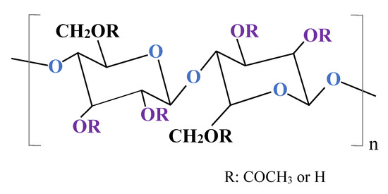 The first RO membrane was developed in the 1950s by Reid et al. [43]. RO technology advanced during the 1970s, mainly by the applications of hollow fiber membranes and the significant development of composite membranes [44]. Since 1980, polymeric NF and RO membranes have dominated the world market [45]. Generally, RO membranes have an ultrathin dense skin layer based on the polymeric support [8]. At present, the application of RO membranes fabricated from various polymers, such as cellulose acetate (CA), cellulose diacetate, polyamides, poly(arylene ether sulfone), piperazine, and chitosan have been studied [24,27,45]. Among them, CA and aromatic polyamides are the most widely applied material for fabrication of commercial RO membranes [46]. Vatanpou et al. [47] have clearly demonstrated that after 2009, the number of articles focused on the CA membranes increased significantly, which confirms the importance of CA in membrane production. Undoubtedly, this finding is related to the fact that CA membranes show a greater number of favourable chemical and materials properties than other membranes. Indeed, due to the presence of hydroxyl groups in the structure (Figure 2), CA membranes have a desirable hydrophilic property [47,48,49,50] and thus a potential affinity for water permeation [51]. Furthermore, they are biodegradable, biocompatible, easily manufactured, cheap, and can be easily derivatized [47,52,53,54]. However, cellulose acetate membranes undergo hydrolytic decomposition resulting in the substitution of hydroxyl groups by acetyl groups and a decline in the membrane performance [55].