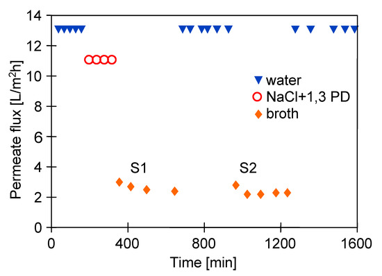 Impact of feed composition on the permeate flux. Feed: distilled water (“water”), solution of NaCl (2 g/L) and 1,3-PD (5 g/L) (“NaCl + 1,3-PD”), fermentation broth (“broth”). TMP = 1 MPa.
