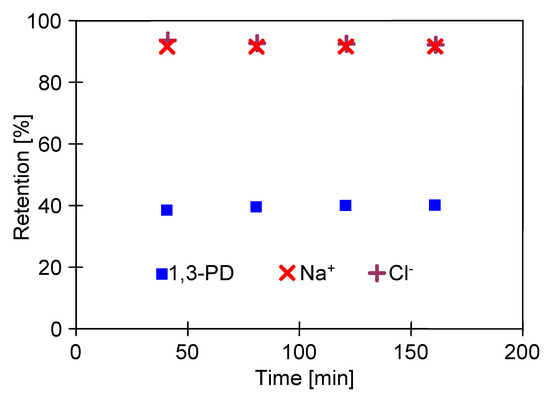 In turn, the results obtained in the present study have demonstrated that the presence of 1,3-PD (5 g/L) in the feed solution had a significant impact on the monovalent salt NaCl (2 g/L) retention by the CA membrane. Indeed, it has been observed (Figure 5) that the retention of salt ions was equal to 92%, which is much lower than the values reported in the literature. Furthermore, it has been determined that the 1,3-PD rejection was equal to about 40%.