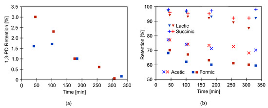 Changes in the retention degrees during separation of fermentation broth: (a) 1,3-propanediol; (b) carboxylic acids. TMP = 1 MPa, blue symbol—Series 1, red symbol—Series 2.