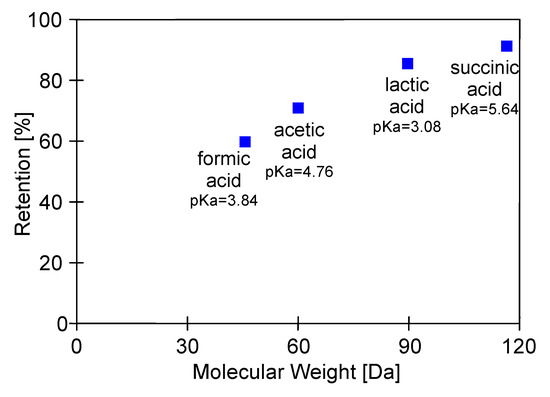 The retention degree in the function of acids’ molecular weight is presented in Figure 7. It can be observed that the acid retention tends to increase with increasing molecular weight, according to the following order: succinic acid > lactic acid > acetic acid > formic acid. This finding is in agreement with previous work published in the literature [83], wherein the rejection of acetic acid by a polyamide membrane was investigated. In the aforementioned study, it was noted that for carboxylic acids rejection increases with increasing molecular mass. Likewise, Diltz et al. [42] reported the positive correlation of rejection degree with the molecular weights of components of simulated biohydrogen broth. Finally, it is essential to mention that in the present study, no relation between acid pKa and retention degree has been found.
