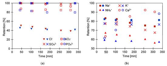 The analysis of the fermentation broths composition indicated the presence in the feed of the following anions: Cl−, PO43−, SO42−, NO3−, and cations as follows: K+, Na+, Ca2+, and Mg2+ (Table 2). The retention degrees of cations and anions during the separation of broths are presented in Figure 8. It can be clearly observed that the used membrane ensured stable ion separation efficiency. Notwithstanding, various reject degrees have been noted. Indeed, divalent (SO42−) and trivalent anions (PO43−) were completely retained by the membrane, whereas the rejection degrees of monovalent anions NO3− and Cl− were significantly lower and equal to about 80% and 40%, respectively (Figure 8a). More specifically, the order of anions rejection was SO42− > PO43− > NO3− > Cl−. According to Epsztein et al. [82] low rejections noted for Cl− and NO3− can be attributed to the absence of the Donnan-exclusion mechanism with the CA membrane.