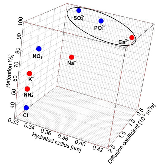 Ion retention as a function of ions hydrated radius and diffusion coefficient. Hydrates radius and diffusion coefficient: data from [86,87,88].
