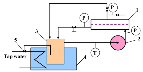 Experimental RO set-up. 1—SEPA-CFII RO module, 2—pump, 3—feed tank, 4—cooling bath, 5—thermostatic Grundfos valve, P—manometer, T—thermometer.