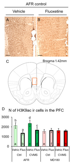 Acetyl-lysine 9 H3 histone (H3K9ac) immunoreactivity (ir) in the prefrontal cortex (PFC). Representative images illustrating H3K9ac-ir nuclei in the PFC of vehicle (Vehic) (A) and fluoxetine (Fluo)-treated PACAP heterozygous control (Ctrl) AFR mice. The imaged area shown in (A,B) corresponds to highlighted PFC region in (C) (scheme modified after Paxinos and Franklin [62]). Histogram (D) illustrates the dynamics of H3K9ac-ir cell counts. Lettering indicates the most relevant significant differences between pairs of groups, according to the post hoc tests (n = 4–6). AFR: animal facility rearing, CVMS: chronic variable mild stress, MD180: 180 min maternal deprivation. Bars: 100 µm.