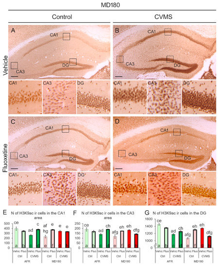 In the DG, the main effects of maternal care (F1,32 = 30.65; p < 10−5) and stress (F1,32 = 15.25; p < 0.001) affected H3K9ac. MANOVA found that the interactions of maternal care × stress (F1,32 = 38.14; p < 10−5), stress × treatment (F1,32 = 15.83; p < 0.001), as well as maternal care × stress × treatment (F1,32 = 74.61; p < 10−6) influenced the histone acetylation in the DG. In AFR animals, the dynamics of H3K9ac-ir was similar to that we observed in the CA1 and CA3 regions: CVMS exposure reduced the immunosignal (bars “a” and “c” in Figure 2G, p < 10−6), which was tendentiously reversed by the fluoxetine administration (see bars “c” and “d” Figure 2G, p = 0.079). The control, vehicle-treated mice that experienced MD180 showed a reduced level of H3K9ac-ir (compare bars “a” and “e” in Figure 2G, p < 10−6). The effect of fluoxetine treatment on the H3K9ac-ir depended on CVMS exposure in MD180 mice: in the control animals, fluoxetine treatment elevated the level of H3K9ac-ir (see bars “e” and “f”, p < 10−5), while in CVMS-exposed mice, the SSRI reduced the histone acetylation (compare bars “g” and “h” in Figure 2G, p < 10−6).