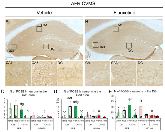 In the CA3 area, ANOVA revealed the main effect of maternal care (F1,32 = 5.118; p = 0.031), as well as the stress × treatment (F1,32 = 11.70; p = 0.018) and maternal care × stress × treatment (F1,32 = 7.616; p = 0.009) interactions, on FOSB-ir to be significant. In the control AFR mice, fluoxetine increased the FOSB cell count (compare bars “a” and “b” in Figure 4D, p = 0.012). CVMS exposure also increased the FOSB signal in AFR mice (compare bars “a” and “c” in Figure 4D, p = 0.008), while fluoxetine reduced this to the basal level (see bars “c” and “d” in Figure 4D, p = 0.008 and images Figure 4A,B). A history of MD180 exposure resulted in the complete absence of FOSB response to fluoxetine (compare bars “b” and “f” in Figure 4D, p = 0.010) or CVMS exposure (see columns “c” and “g” in Figure 4D, p = 0.034).