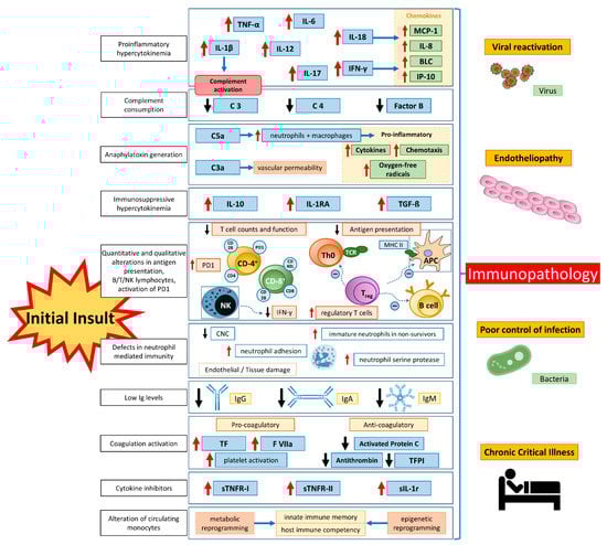 This systemic increase of pro- and anti-inflammatory cytokines in the early phase is considered the classic hallmark of sepsis. The proinflammatory components cause inflammation which, if systemic, can lead to progressive tissue damage and to organ dysfunction. Concomitant immune suppression caused by downregulation of activating cell surface molecules increases apoptosis of immune cells, and depletion of T cells leads to “immune paralysis” in later stages of the disease course, making the organism susceptible to nosocomial infections, opportunistic pathogens, and viral reactivation [,].